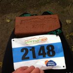 Es war kalten Regen mit dem + 4°C. Nach dem Zielbereich erhielten jeden Teilnehmern ein roten Baustein statt Medaillen. Interessant! Sein Schuh war stark schmutzig.
