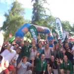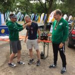 Für den Samstag kündigte sich früh schwülwarmes Wetter an. Entsprechend fuhr man bereits vormittags nach Chieming, um sich an das Klima zu gewöhnen und sich auf die Staffelteilnahme vorzubereiten. Dazu gehört einmal an den Chiemsee zu gehen, um die Schwimmstrecke anzuschauen. Sie wurden mit großen gelben Bojen abgesteckt. Wer hier am Ufer steht, weiß warum hier viele Bildmotive entstehen. Im Hintergrund sind die Alpen zu sehen und mitten auf dem See die beiden Herren- und Fraueninsel. Für Urlaub waren allerdings die Gehörlosen Bielefelder nicht vor Ort. Während Ulrich gemeinsam mit Martin auf dem Sattel die Radstrecke inspirierten, schaute sich Benjamin das Streckenprofil auf den ersten hundert Metern für die Läufer an. Die Veranstalter schrieben das Thema Inklusion groß auf die Fahne. Der Start mit den hörenden Triathleten erfolgte gleichzeitig mit den Gehörlosen- und Paratriathleten. In der Volksdistanz stand 500m Schwimmen, 20km Radfahren und 5km Laufen auf dem Programm. Mit vier sehr lauten Böllerschüssen gingen die Schwimmer um Martin Koppe ins Wasser. Im hektischen Gewimmel versuchte jeder Sportler seine Positionen zu verteidigen, dazu gehörte auch die (unfairen) Versuche, den Gegner mit einer Hand oder Ellbogen aus dem Weg zu räumen oder zur Seite zu stoßen. Martin hat damit zu kämpfen gehabt. Die schnellen Schwimmer hatten nach vorne freie Bahn. Unten ihnen befanden sich der Gehörlose Deutsche Meister Kilian Deichsel und die ehemalige Kaderathletin im Schwimmen Katrin Schliwa. Sie holten einen Vorsprung beim Wechsel zum Rad heraus. Martin, immerhin in ordentlichen 10:43min als 3. unter den Gehörlosen, übergab den Staffelholz an Ulrich weiter. Als Staffelholz diente ein Zeitchip am Fußgelenk. Ulrich, der zuvor noch nie ein Radwettbewerb teilgenommen hatte, machte sich mit dem von Martin geliehenem Rad auf die Runden durch das schöne Chiemgau. Auf fast flachen Terrain musste er die Strecke 3x umrunden. Wie es ist, in der Sonne bei 27 Grad zu fahren, kann sich jeder selbst ausmalen. Als er sein Rad nach knapp 38min an richtiger Stelle in der Wechselzone abstellte, hat er zwar den 3. Platz verteidigen können, aber gegenüber den Vorplatzierten weitere Zeit eingebüßt. Mit wackeligen Beine lief Ulrich zu Benjamin, um dessen Start nach Übergabe des Staffelholzes freizugeben. Gemäß dem Teamname „Fast & Deaf“ (engl. für Schnell & Taub) machte sich Benjamin mit großen Schritten auf die Strecke. Einerseits um das Podestplatz abzusichern, anderseits um vielleicht nach vorne noch Plätze gut zu machen. Mit drei bzw. fast fünf Minuten Rückstand auf den 2. und 1. eine Menge Holz, zumal niemand weiß wie stark die Läufer sind. Die 2,5km Strecke musste jeder 2x umrunden (wie sich später aber herausstellte, waren es auf 5,6km auf der Uhr). Als nach etwa 3km der 2.-platzierte überholt wurde, stellte sich die Frage, wo ist der Führende? Wie sich hinterher herausstellte, begab sich dieser nach einem Missverständnis auf eine 3. Runde und fiel in der Endabrechnung auf Platz 9 zurück. Sein Pech ist unser Glück. Als Benjamin noch die Schirmherrin Verena Bentele (mehrfach Paralympics Siegerin) überholte, war das Ziel nicht mehr weit. In guten 23min erlief er mit der schnellsten Laufzeit für das Team zum Staffelsieg und immerhin zum 11. Platz von 56 Startern im Gesamteilnehmerfeld! Da ist zu verschmerzen, dass das Team die Ehrung verpasste und nachträglich ein gut gefüllter Beutel als Preis vom Veranstalter überreicht wurde.
