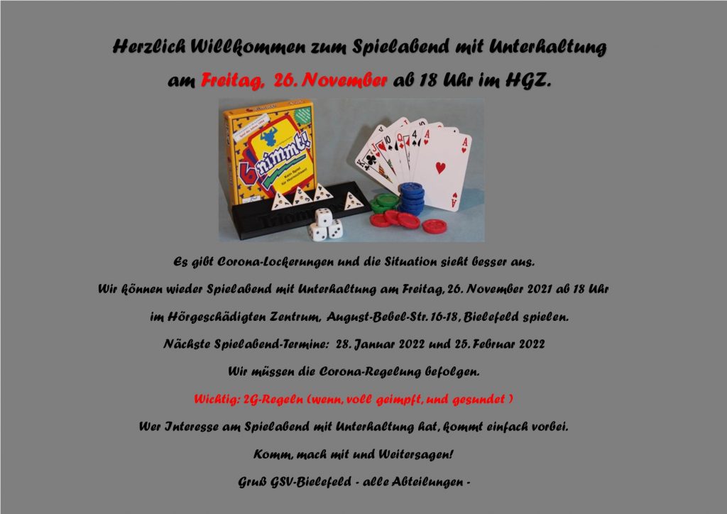 archiv Herzlich Willkommen zum Spielabend mit Unterhaltung am Freitag, 26. November 2021 ab 18 Uhr im HGZ by florianbueker 24. November 2021