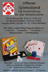 archiv Spieleabend und Unterhaltung am 23.11.2018 by florianbueker 18. November 2018 Hallo Mitglieder, am nächsten Freitag, 23.11.18 um 18 Uhr findet das Spieleabend und Unterhaltung im UWZ statt. Seid ihr herzlich Willkommen !
