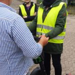 Zunächst bekamen wir alle ein Einleitungs- und Sicherheitsvorschriftsplakat, welches wir alle durchlesen und unterschreiben mussten. Der Inhaber Frank Korfsmeier und Mitarbeiter Wolfgang haben uns eine Einweisung gegeben, wie wir mit der „ Wippe“ umgehen müssen. Danach konnten wir auf dem Hof die ersten Runden drehen, das Kurven fahren und Bremsen üben. Ein Huhn hat aufgegeben wegen der Gleichgewichtsstörung.